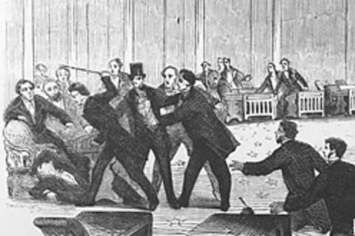 But revering a code of conduct is not the same as acting in accord with it. Occasionally history gives us a rich story in which hypocrisy is called out. Such was the case with a chain of events precipitated by the caning of Senator Charles Sumner (R-Massachusetts) by Congressman Preston Brooks (D-South Carolina). You see, Sumner (an Abolitionist) had several days previous made a speech denouncing slavery and criticizing some Southern congressmen by name. Enraged by this, Brooks wanted to challenge Summer to a duel, but was persuaded otherwise. Brooks would instead unapologetically beat Sumner unconscious on the floor of the Senate, June 1856. “Bully” Brooks enjoyed a popularity surge from his confederates following the assault.