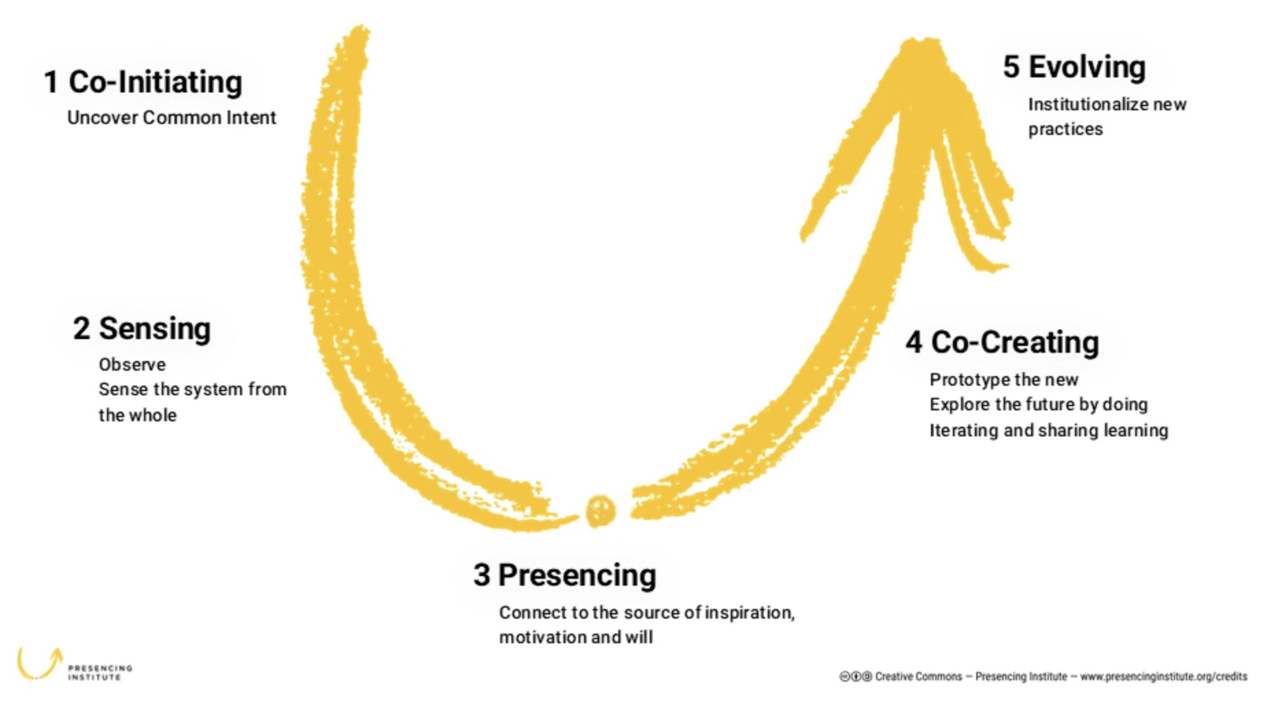 As we move down the left side of the U, we allow ourselves to connect with the world outside our bubble. Reaching the bottom of the U, we suspend our common assumptions and thinking, letting come our highest future possibility. Finally as we ascend the right side of the U, we bring forth the new into the world.