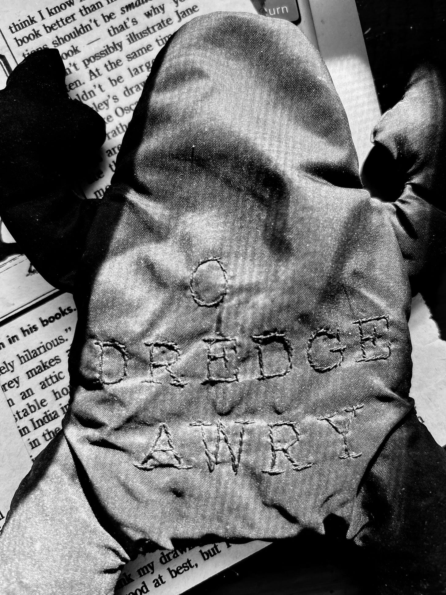“I make them out of old umbrellas,” he explained from a large chair in the middle of the room where he sat stroking one of the cats, an orange tabby named Agrippina. “If you walk down Fifth Avenue after a windstorm, you are bound to run across a fine collection of umbrellas turned inside out and discarded. I salvage the material.” He spoke of his frogs with a childlike enthusiasm. “I saw ones like these in a cheap gift shop and I said to myself ‘I bet I can make these. I bet I can can make ones better than these.’” He rose from his chair and reached up to one, his favorite. He explained that he often stitches messages on the stomachs of the frogs. This red and black frog said: LIFE IS LIFE.