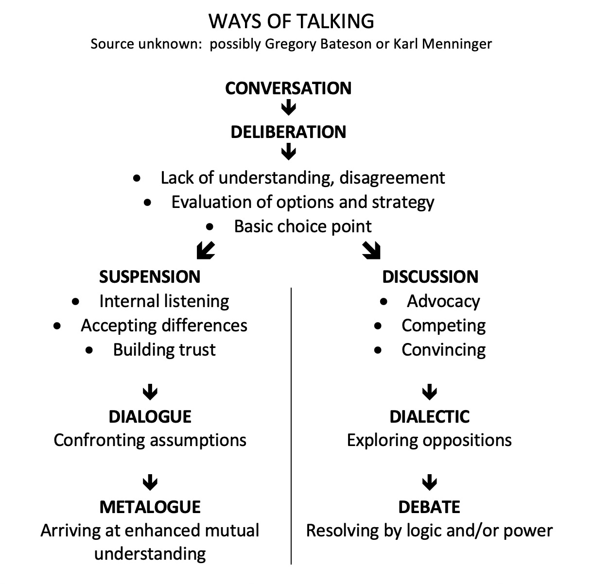 I found this little diagram called “Ways of Talking” in connection with my work as an organization development specialist for Human Resources at Johns Hopkins Hospital in the late 1900s: