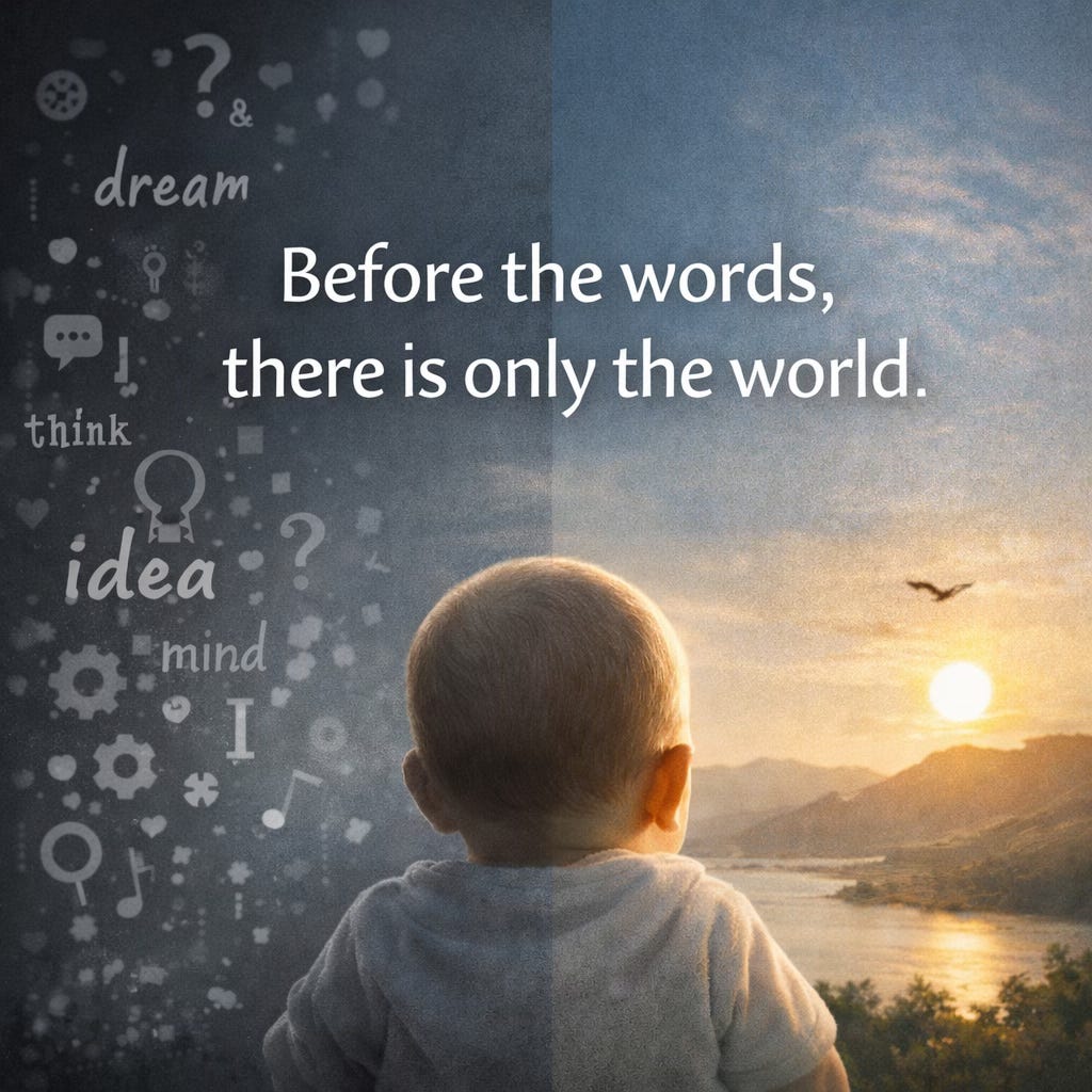 Before young humans become verbal — understanding and speaking in order to express themselves — what do their thoughts consist of? It is difficult to reconstruct the state of affairs behind the eyes of that buddha baby.