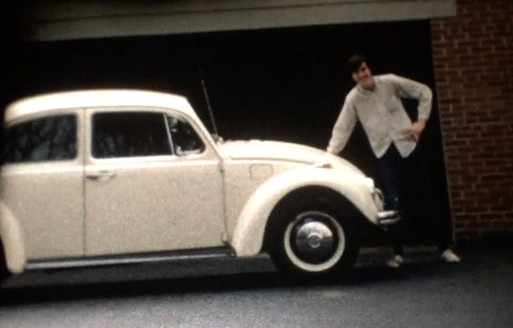 My sister Pat (two years older than me, and in 12th grade in 1970) had a 1969 white Volkswagen Beetle, which I learned to drive. Trunk in the front, engine in the back. Stick shift. Roll-down windows. Nothing fancy.