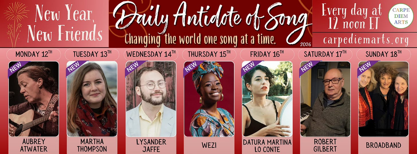 I would normally put this in a footnote, but it is important enough to elaborate here. The Daily Antidote of Song was launched in April 2020 by our friend Jo Rasi as a simple yet powerful response to isolation and fear. The program continues today — 2,118 consecutive days as of this posting — with a mission to promote peace and justice, joy and connection.